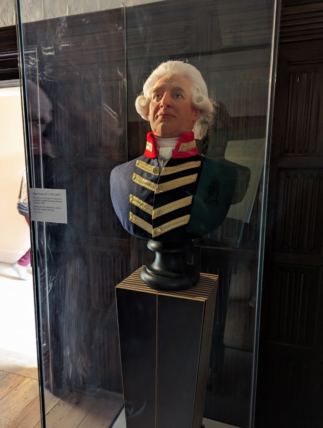 This model of King George III was taken from an original modelled from life by Madame Tussaud in 1809. (And I had no idea Mme Tussaud was making waxworks two hundred years ago.) The model stands at the King’s surprisingly small height. Plump and fair, he looks nothing like his tall, dark and handsome Netflix counterpart, Corey Mylchreest.