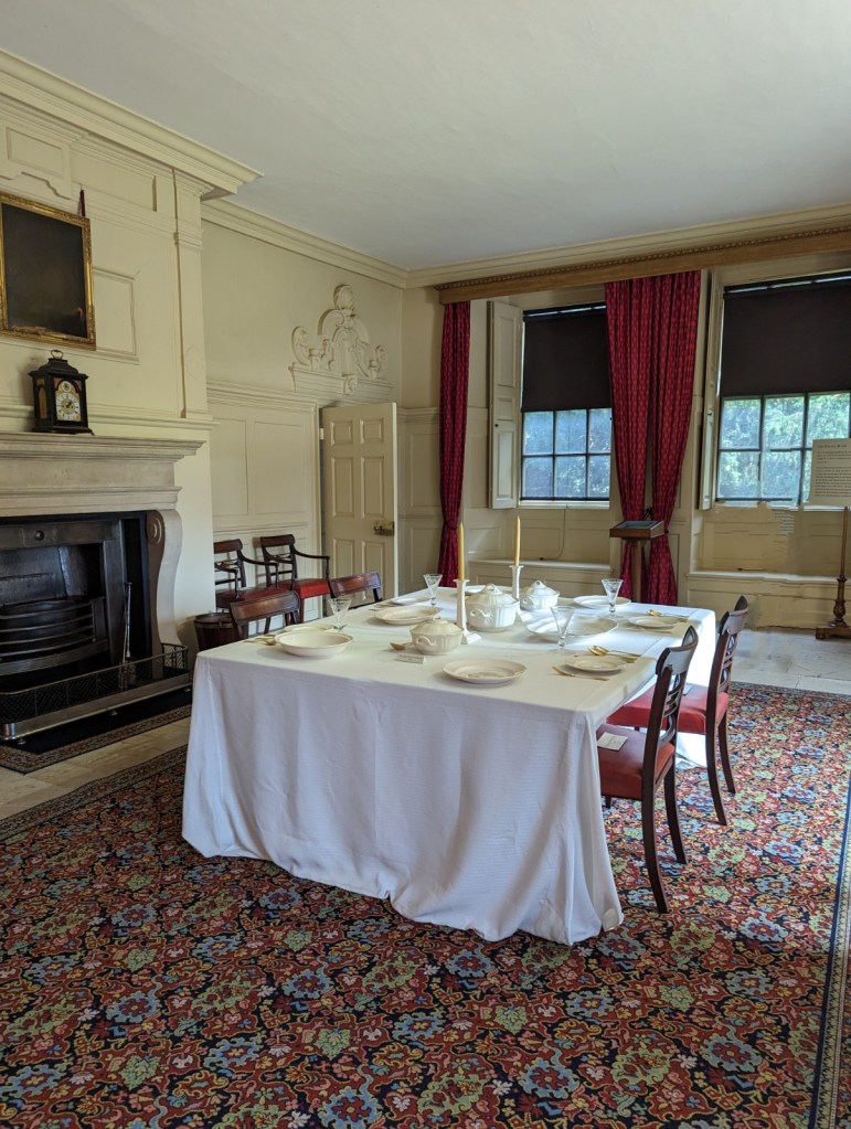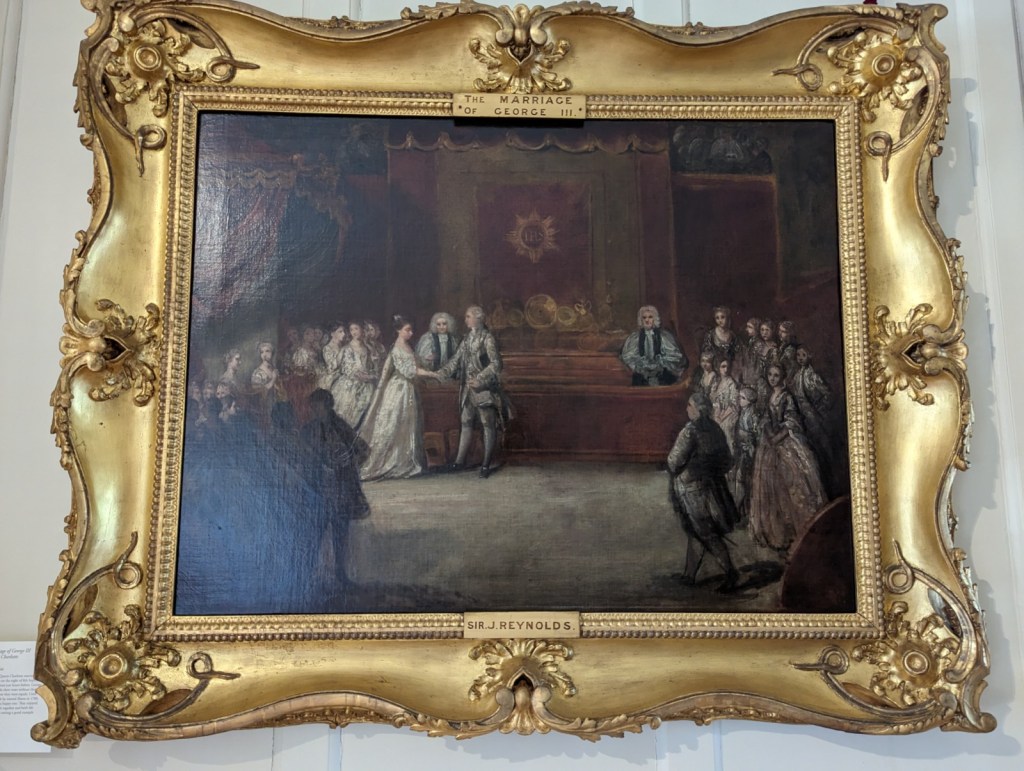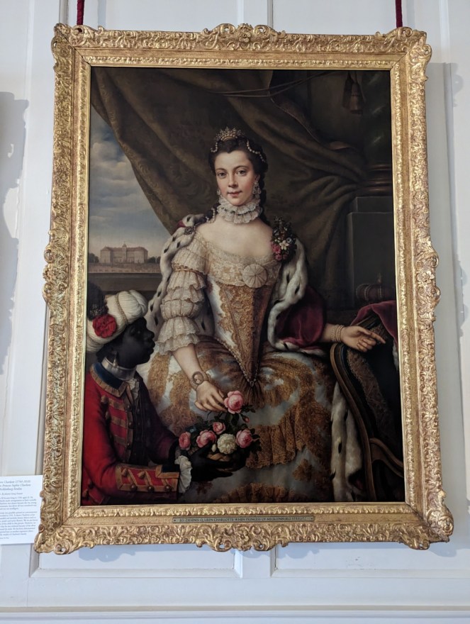 This portrait of Queen Charlotte hangs in the palace entrance. Here, she appears fair-skinned, although many historians say she had African heritage. (More on Bridgerton and Charlotte’s heritage here.) What struck me most forcefully in this portrait, though, is that the young Charlotte has a black slave. I found this a totally unexpected shock.